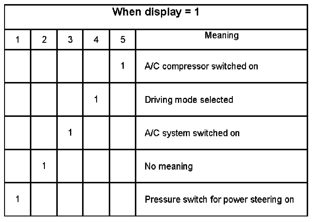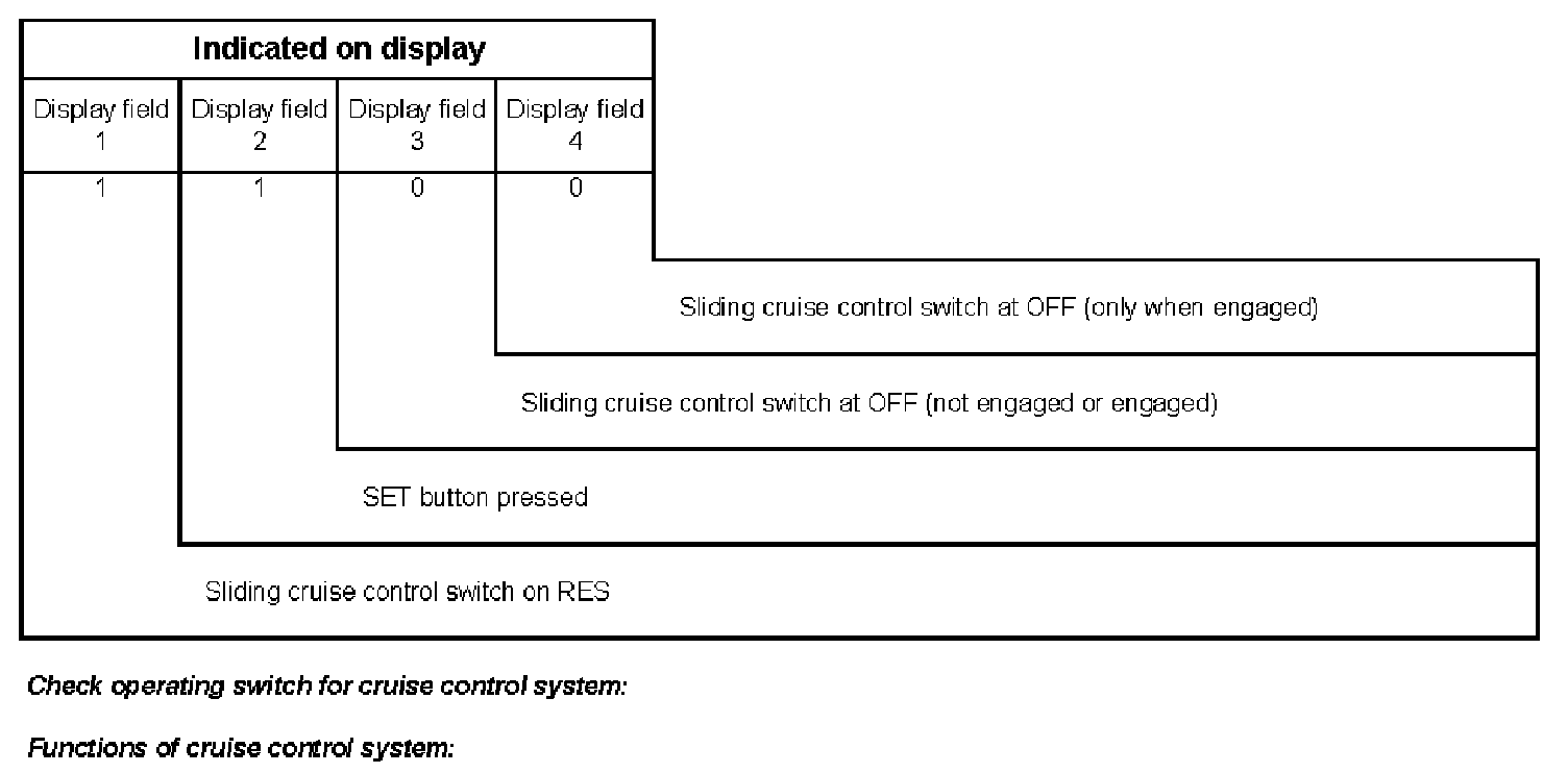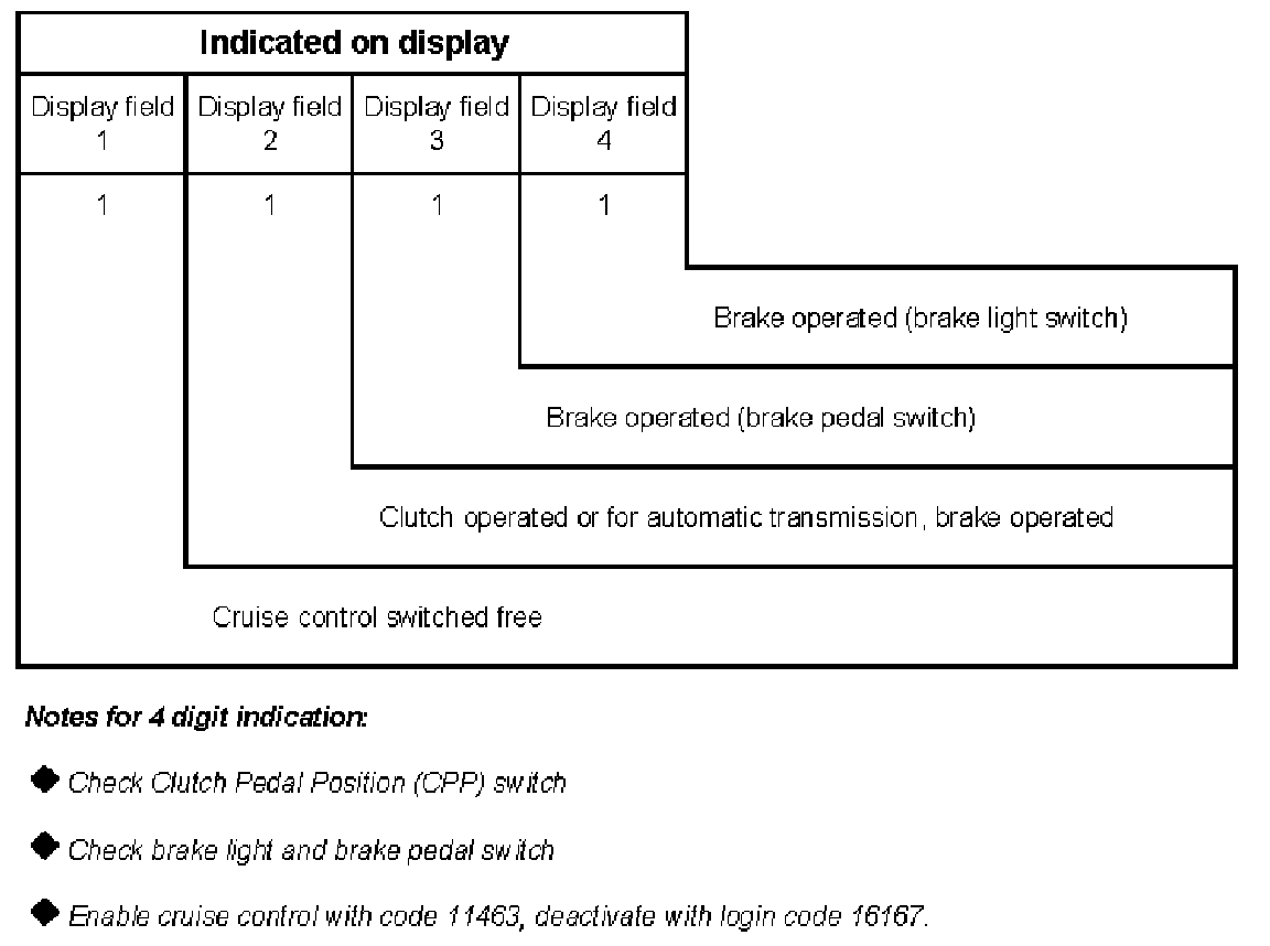 Explanation of digits in 4-digit indication, display field 2, switch for brakes, clutch and cruise control.