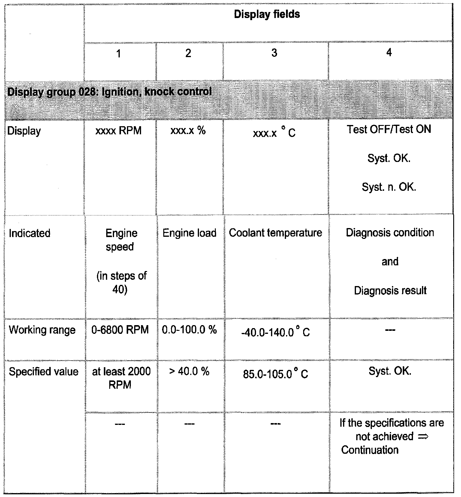 - Carry out road test and check knock control Specified values on display (display fields 3 and 4).