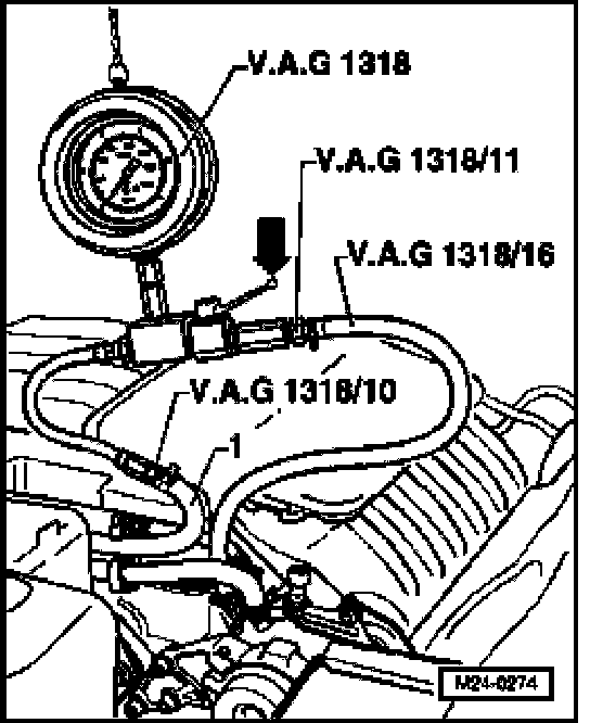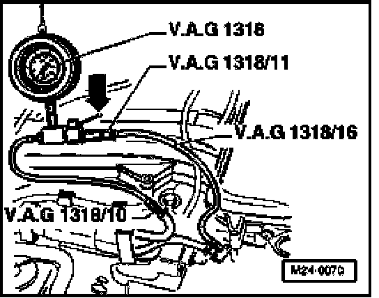 - Connect pressure gauge V.A.G 1318 to adapter V.A.G 1318/10 at supply hose and to adapter V.A.G 1318/11 and hose adapter V.A.G 1318/16 at supply line.