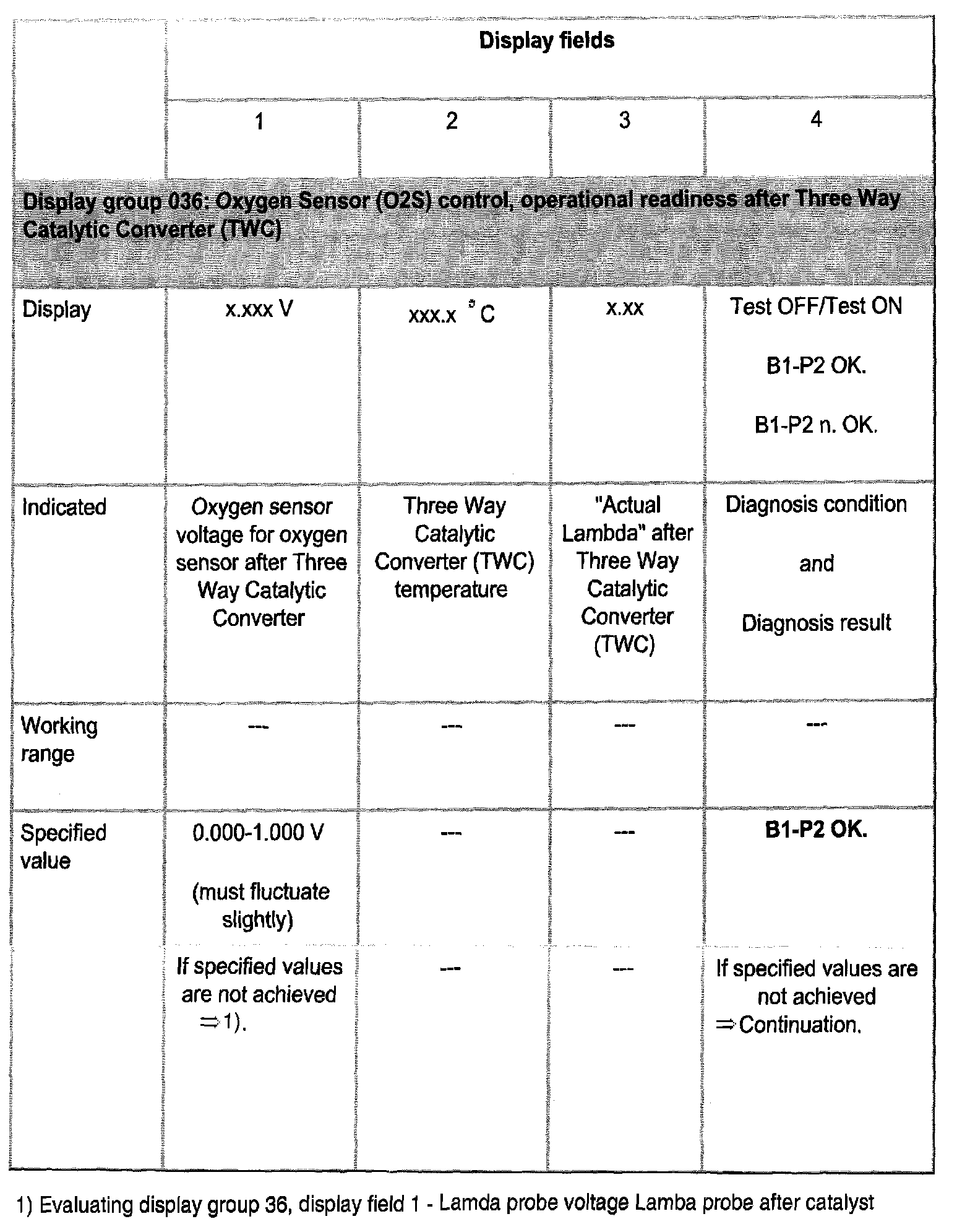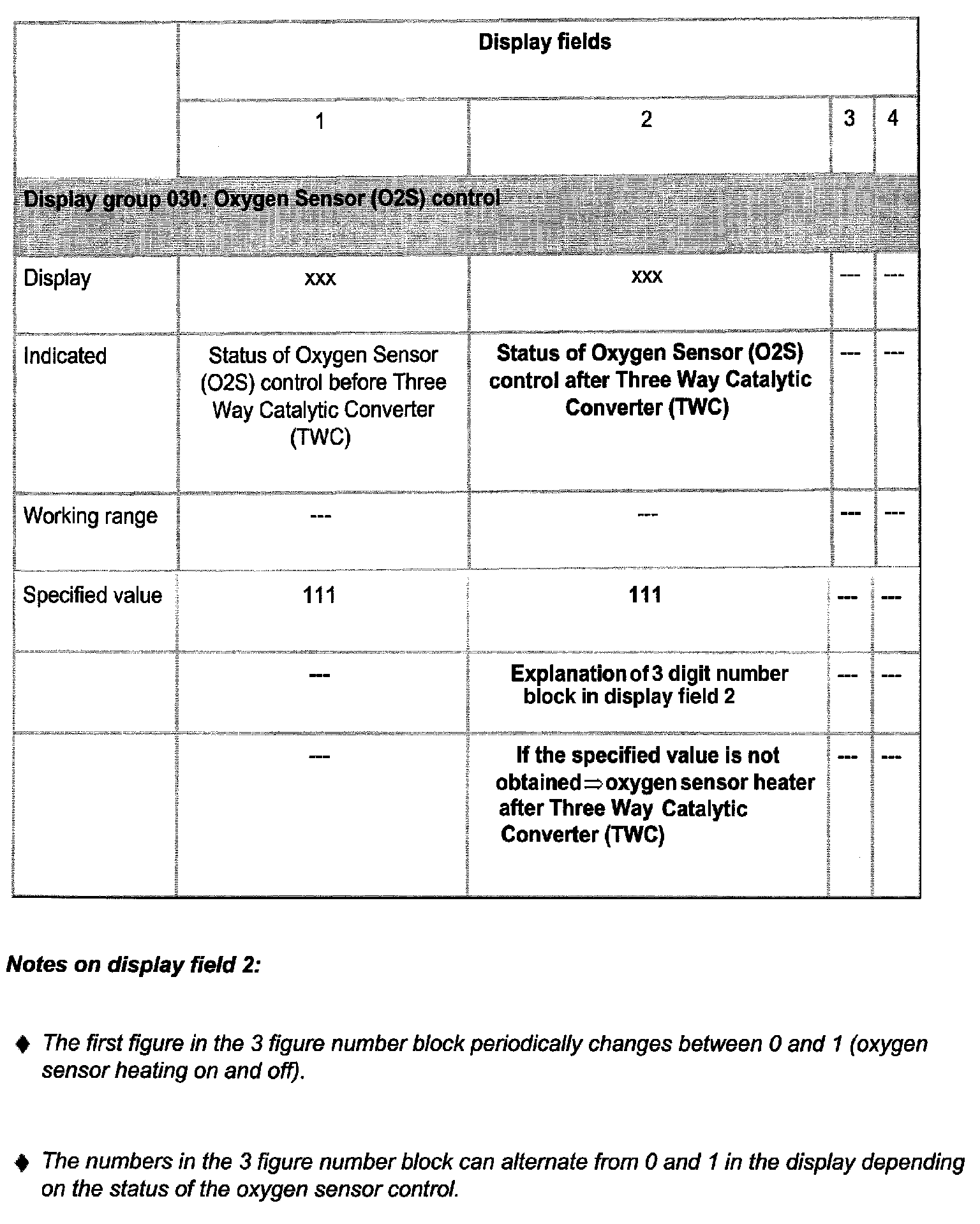 - Check status of oxygen sensor control after Three Way Catalytic Converter (TWC) (display field 2).