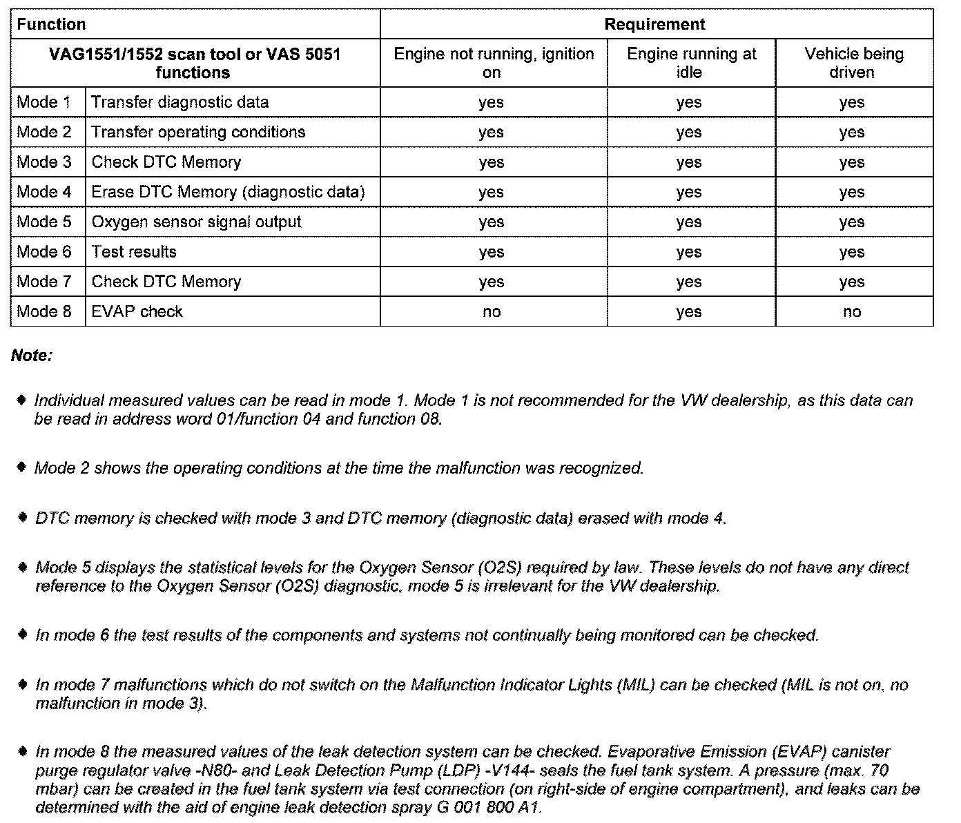 Selectable functions (mode) in address word 33, CARB / OBD II