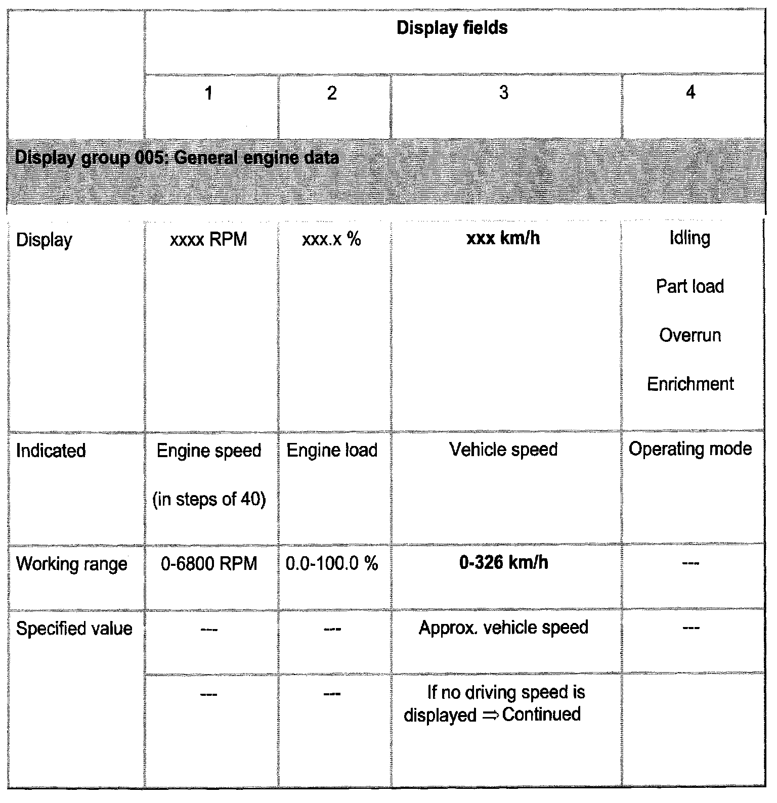 Indicated on display: (1-4 = display fields)