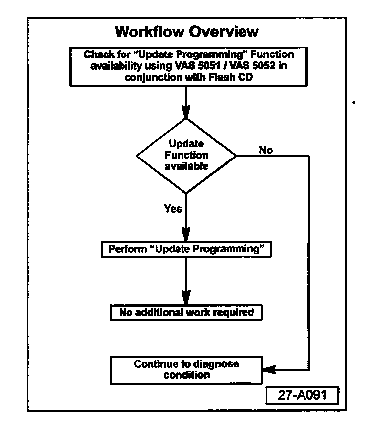 VAS 5051 or 5052 must always be connected to the approved power supply at the approved voltages. Under no circumstances should the power supply be interrupted or the diagnostic connector unplugged during the flash procedure.