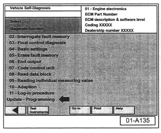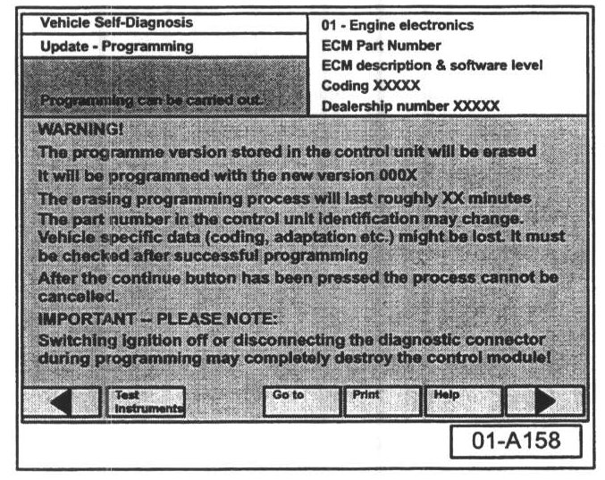 Once "Update - Programming" function has been started, switching ignition OFF or disconnecting the diagnostic connector may completely destroy the ECM.
