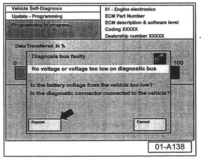 - The "Update - Programming" (flashing) process must then be started from the beginning using the "Repeat" button (arrow). DO NOT use the "Cancel" button.
