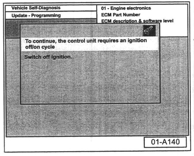 - Switch ignition ON when prompted. After switching ignition ON, the ECM has been re-initialized, however, fault memories must now be erased.