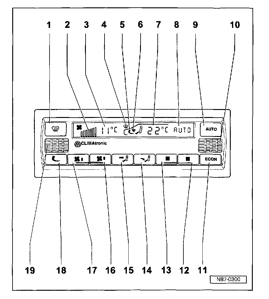 - Function "air flow to footwell" is displayed or goes out when pressing button -14-.