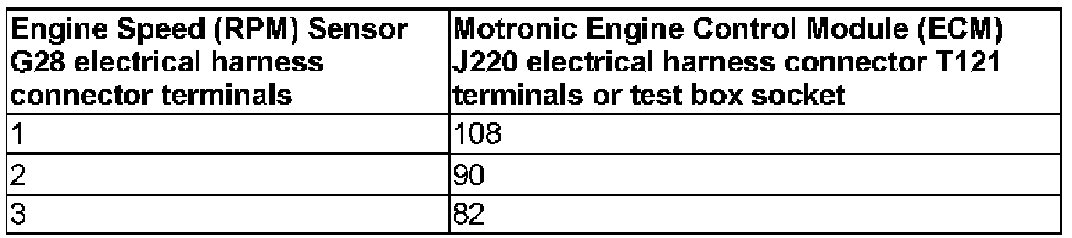- Using a Multimeter, check the Engine Speed (RPM) Sensor G28 electrical harness connector terminals to the Motronic Engine Control Module (ECM) J220 electrical harness connector T121 terminals for an open circuit.