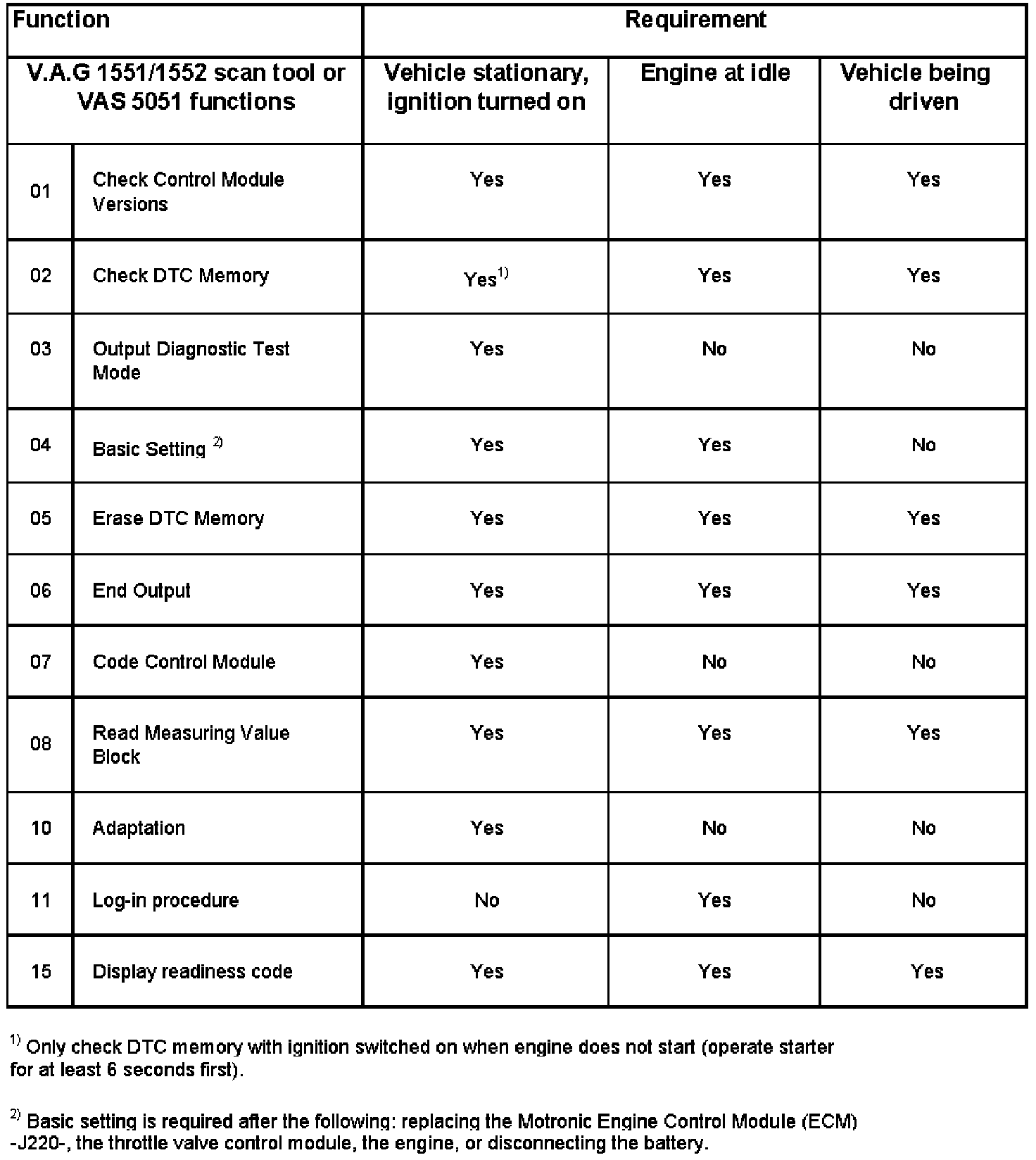 Selectable Functions When Using VAG1551/1552 or VAS5051