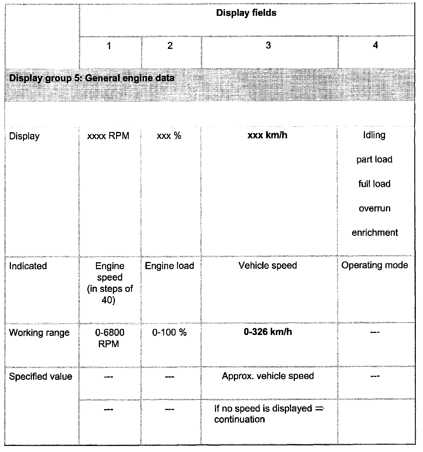 Indicated on display: (1-4 = display fields)