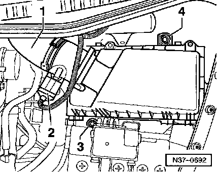 - Remove intake hose -1- and connector -2- from Mass Air Flow (MAF) Sensor.