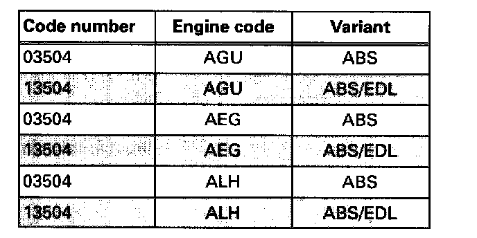 ^ If the control module is incorrectly coded ABS warning light -K47- will light up continuously, and warning light for brake system -K118- lights up when 6 mph (approx. 10 km/h) or an engine speed of 2000 rpm has been exceeded once. An entry is made in DTC memory at the same time, Check DTC Memory (scan toot function 02).