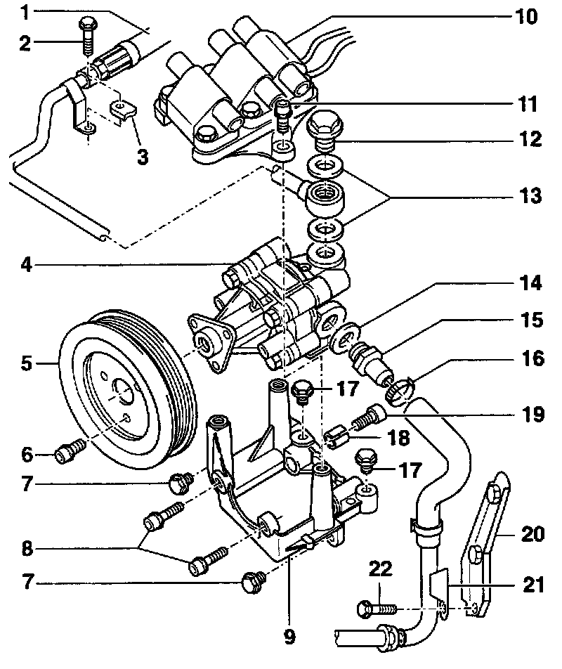- Unbolt bracket, item-9-, and remove complete with power steering pump.