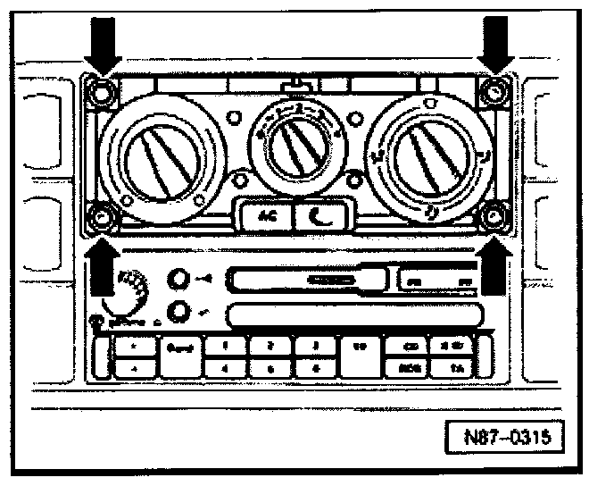 - Carefully remove trim panel by depressing locating lugs -arrows- with a covered screwdriver. Do not damage instrument panel.