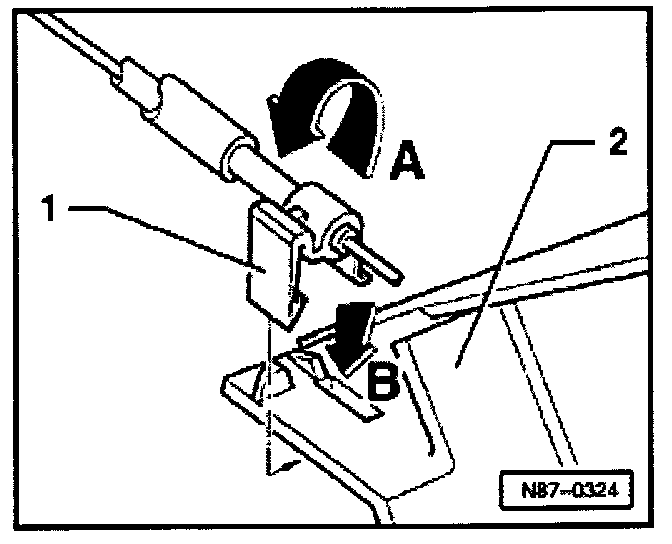 - Turn -arrow A- temperature flap cable -1- until it engages into air distributor housing -2-.