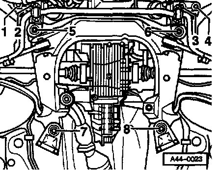 - Loosen bolts -1-, -2-, -5-, -6-, -7- and -8- .