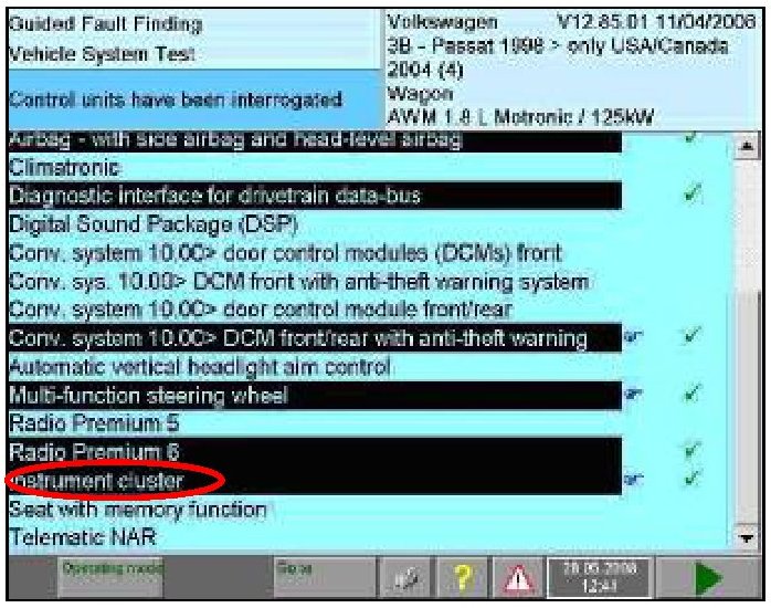 - If GFF did not highlight the control unit, select Instrument cluster manually to interrogate control unit -circle-