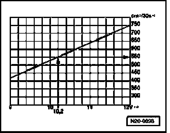 During test, a voltage of 12.2 volts is measured at battery. Since the voltage at the pump is approx. 2 volts less than battery voltage, there is a minimum delivery rate of 550 cubic cm/30 s.