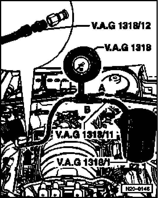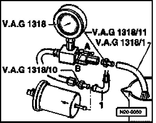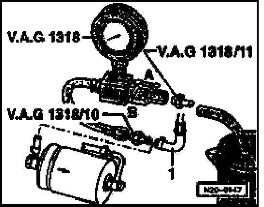 - Connect V.A.G 1318 pressure gauge to hose using V.A.G 1318/10 adapter.