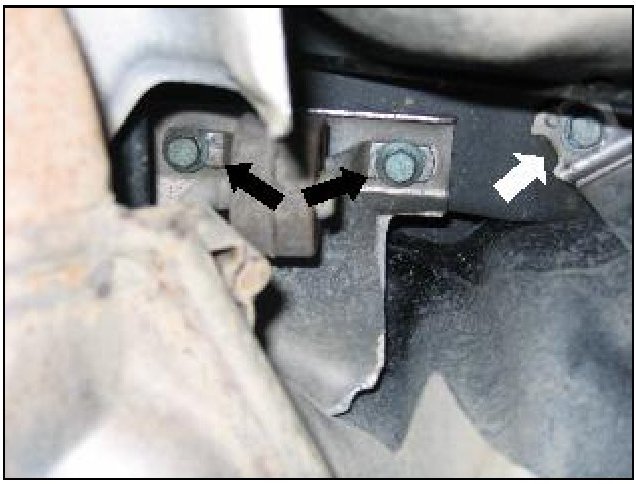 - Remove bolts -black arrows- for exhaust hangers on both left and right exhaust pipe, then remove both bolts -white arrow- for left and right fuel tank straps