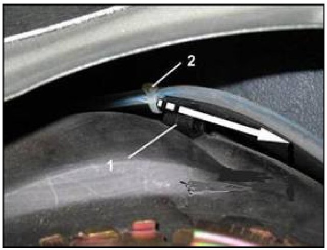 - Secure electrical wiring to vent hose -1- with a new zip tie -2- and move zip tie as shown in image to ensure tension is no longer present