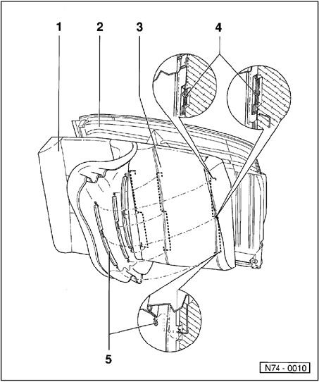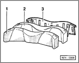 - Remove cover with piping sewn in from carrier flange, cut through cushion clamps and unhook cushion wires using awl V.A.G 1636 from cushion .