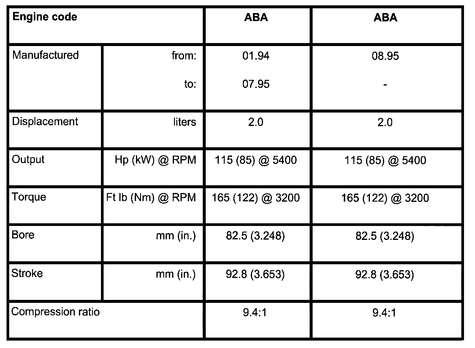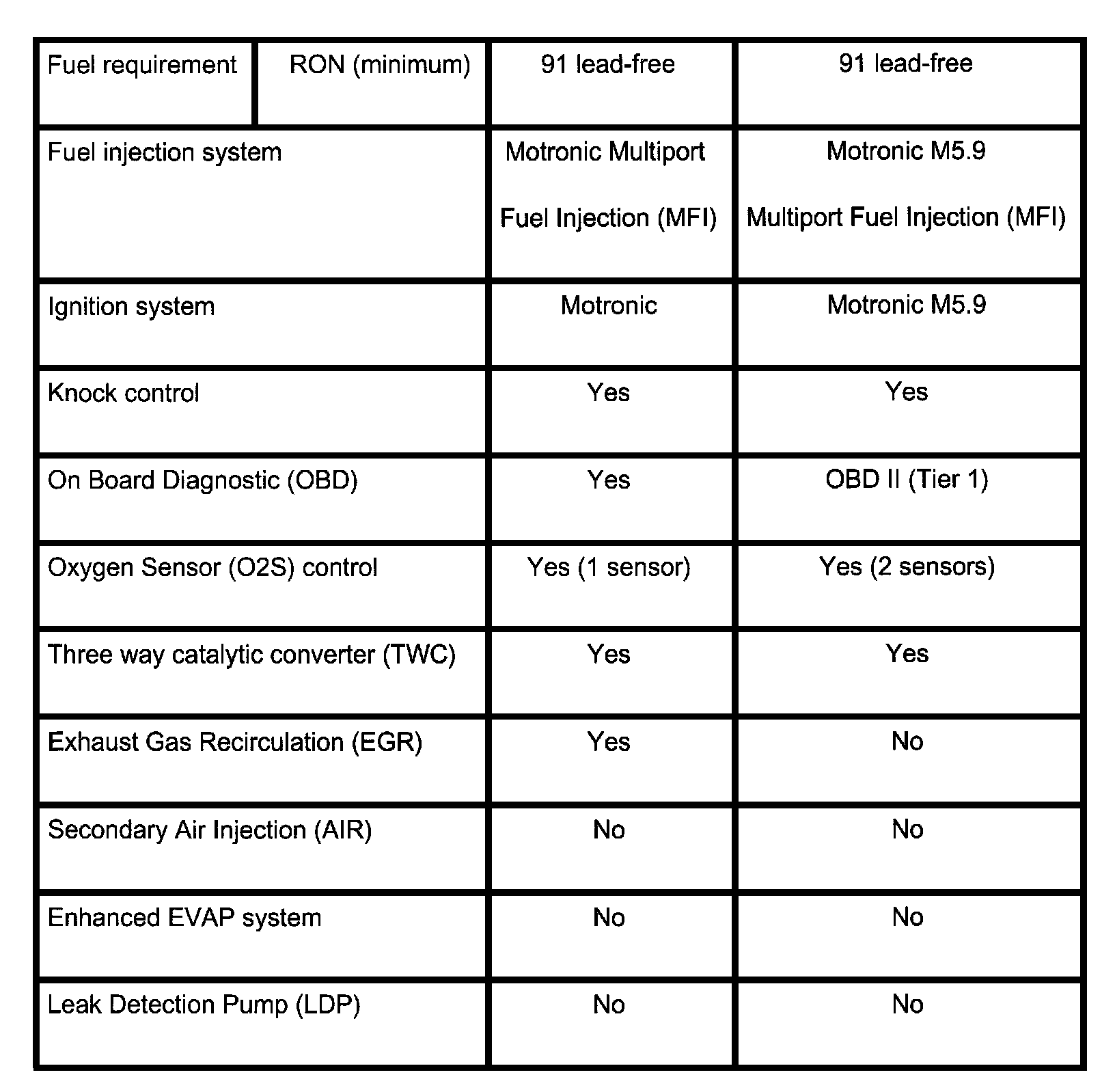 Engine specifications Cabrio