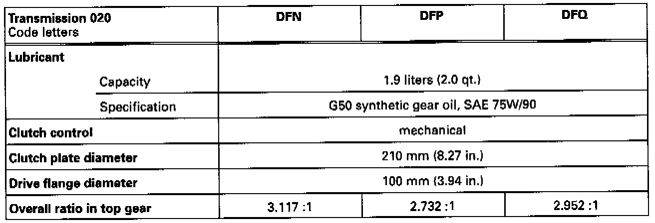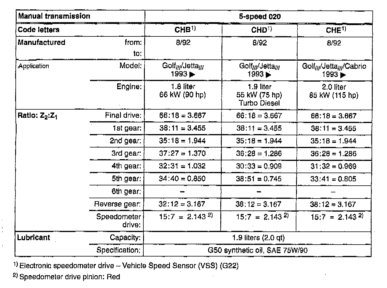 APPLICATIONThe 020 5-speed manual transmission is installed in Golf, Jetta and Cabrio vehicles equipped 1.9 liter Diesel and 2.0 liter engine versions.