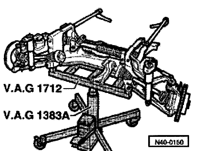 ^ Place VAG1383 transmission support with VAG1712 front axle support below subframe.