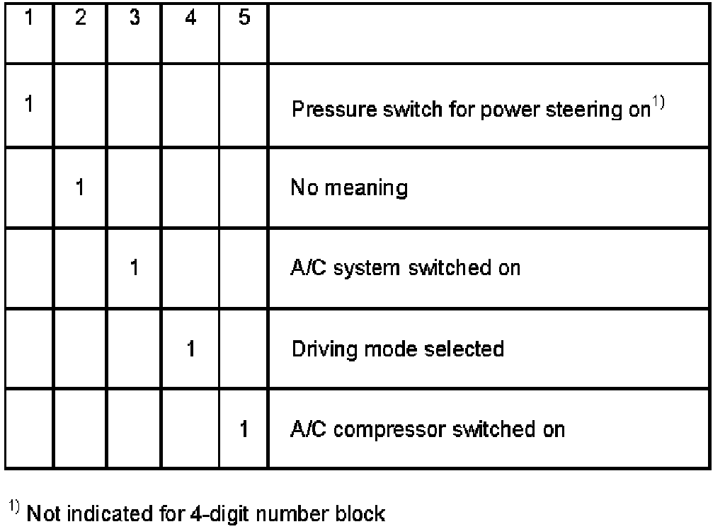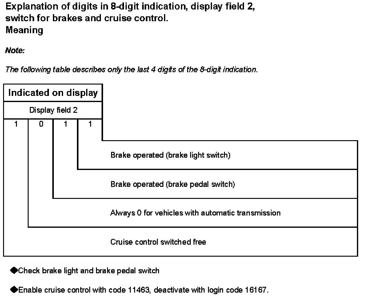 Explanation of digits in 8-digit indication, display field 2, switch for brakes and cruise control.