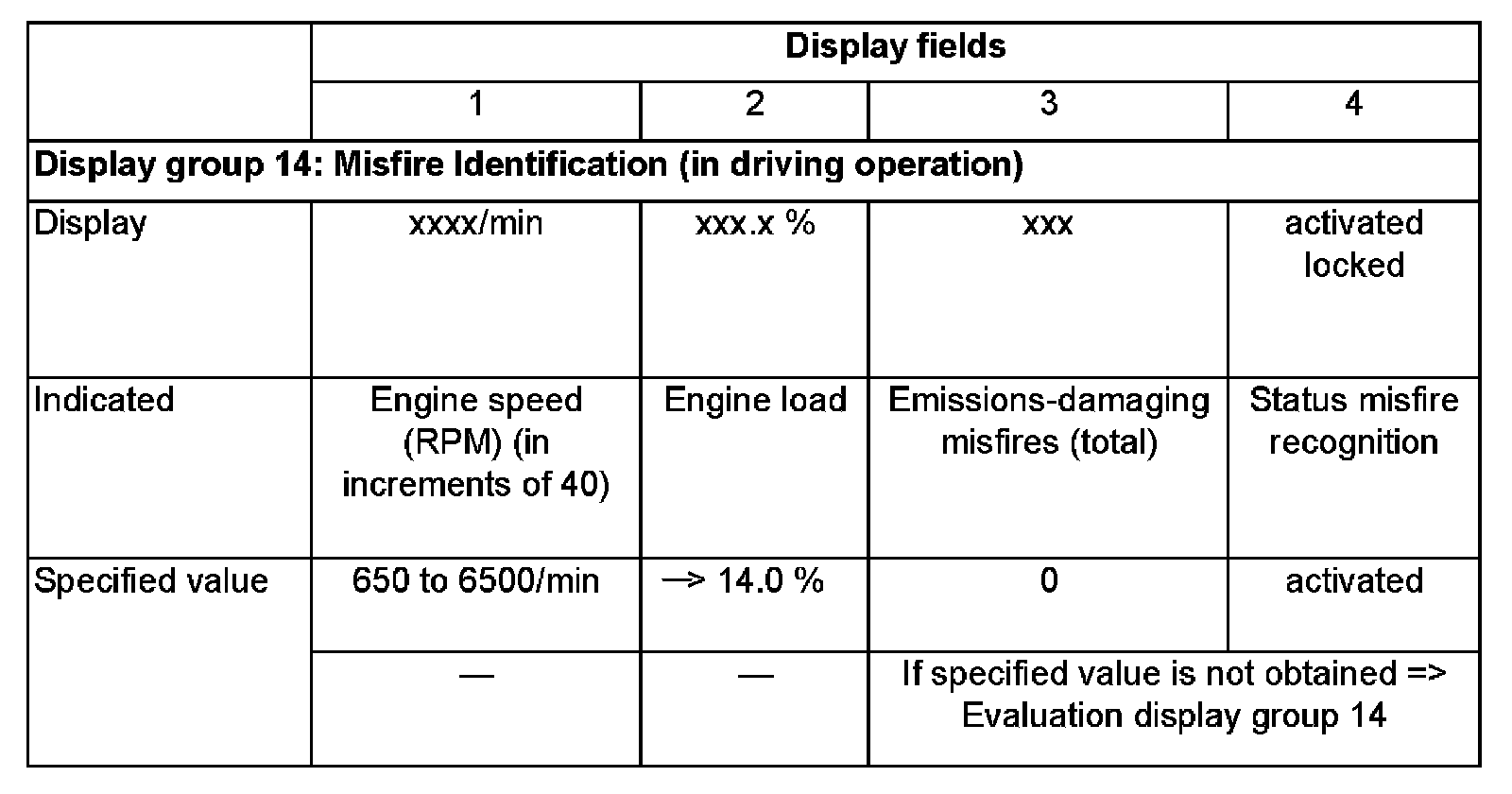 Evaluation display group 14, display field 3 - total number of emissions -damaging misfires