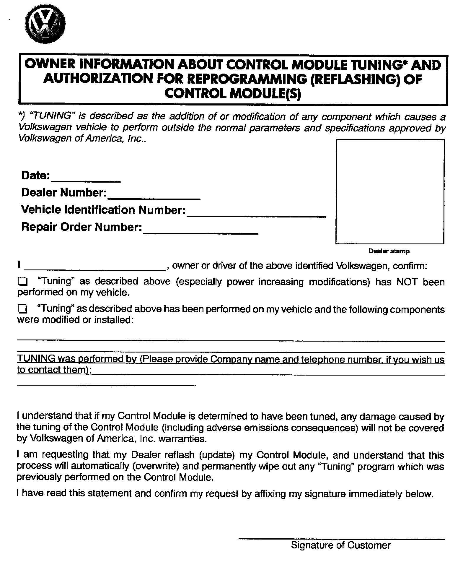 ^ Your Dealership should place the vehicle owner on notice in writing, that their ECM was found to have been tuned, and that any damage caused by the tuning of the ECM (including any adverse emissions consequences) will not be covered by Volkswagen of America, Inc. warranties.