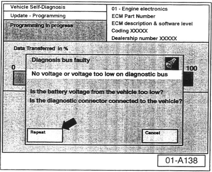 - The "Update - Programming" (flashing) process must then be started from the beginning using the "Repeat" button (arrow). DO NOT use the "Cancel" button.