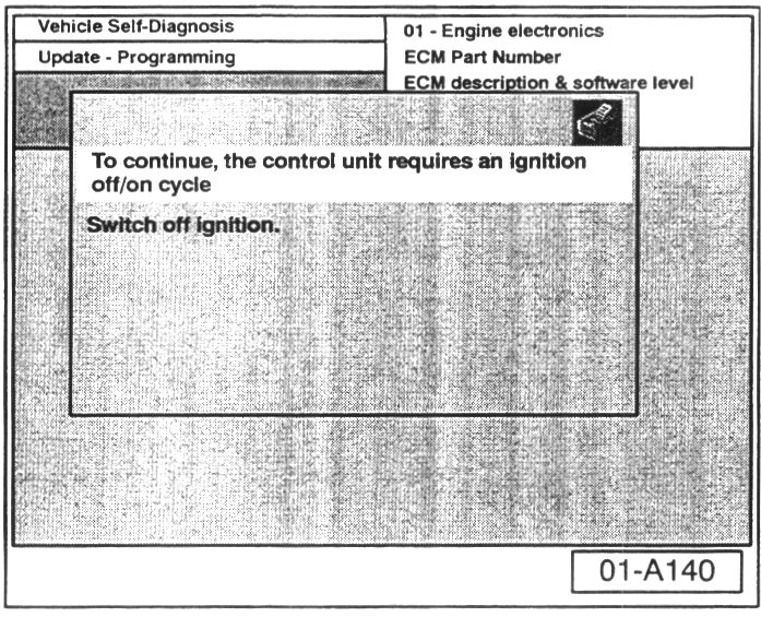 - Confirm that VAS 5051 or VAS 5052 diagnostic tool power supply is adequate and that ALL appliances with high electromagnetic radiation (i.e. mobile phones) are switched OFF.