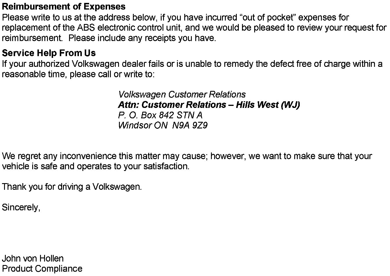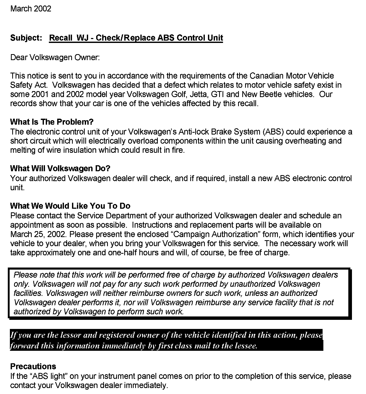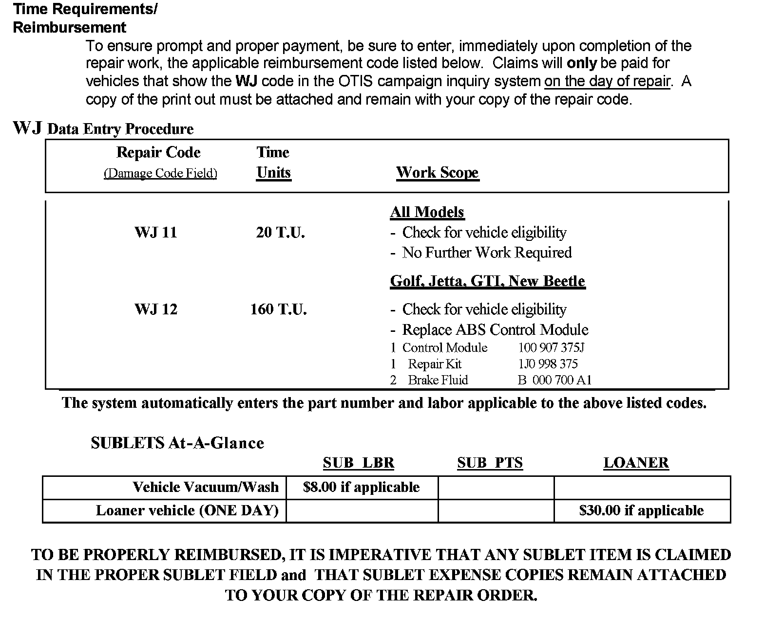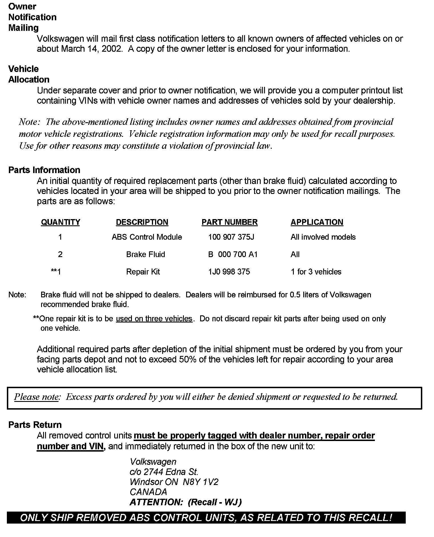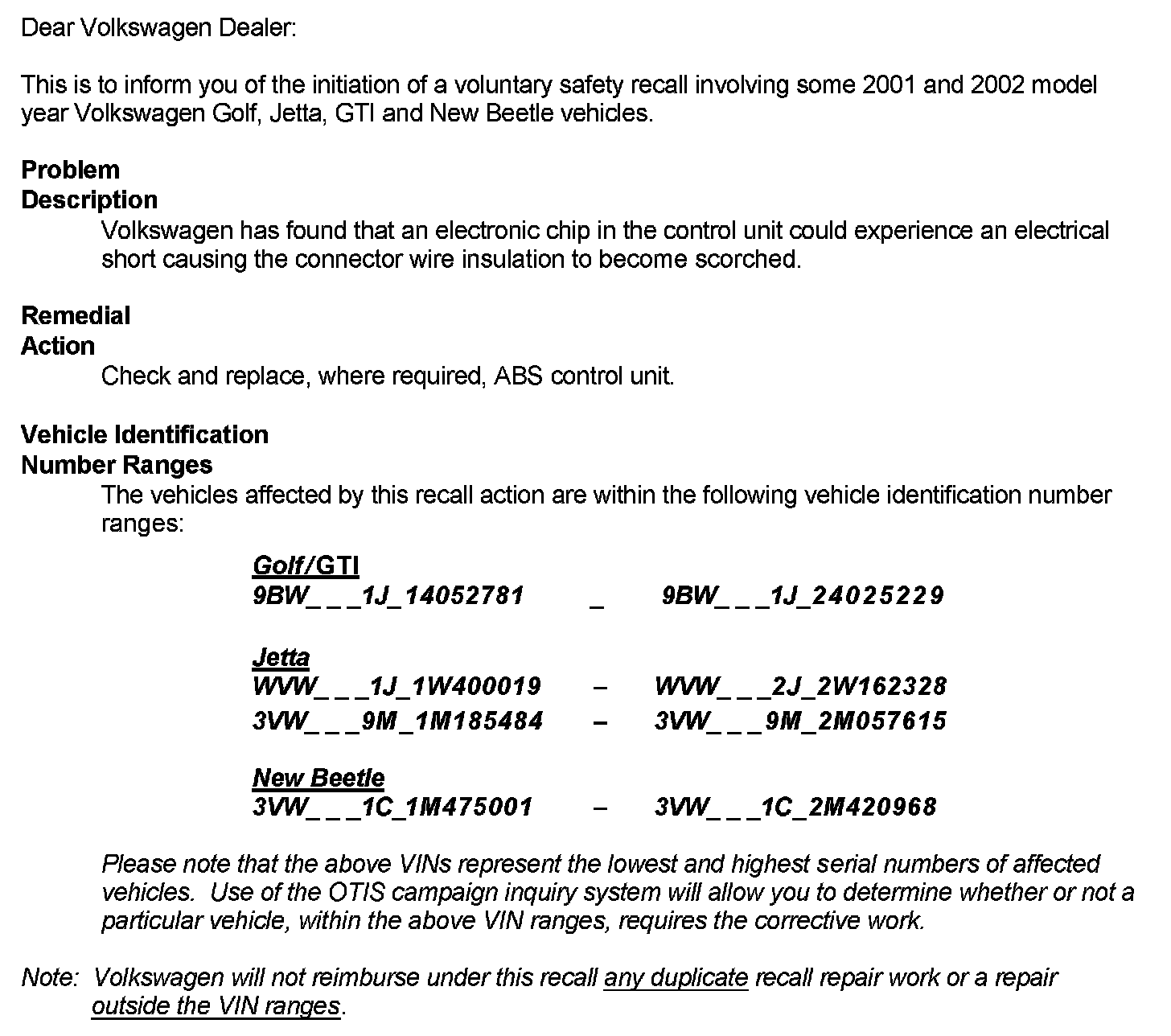 2001/2002 Model Year Volkswagen Golf, Jetta, GTI and New Beetle Check/Replace ABS Control Unit