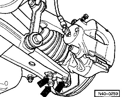 - Mark installation position of ball joint bolts on left control arm and remove bolts (arrows).