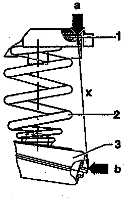 ^ The measurement is taken from the spring mounting steel plate edge (arrow -a-) to the top edge of the assembly hole in the control arm (arrow -b-).