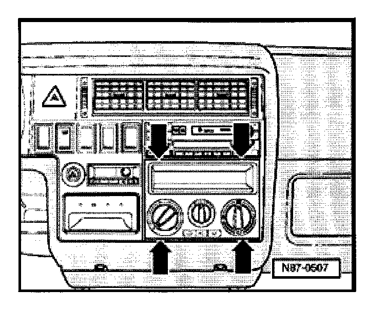 - Carefully remove trim panel locating lugs -arrows- with a screwdriver. Take care not to damage instrument panel.