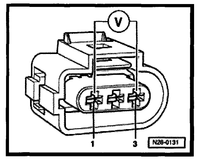- Use adapter cables from VAG1594 to connect multimeter for voltage measurement to terminals 1 (B+) and 3 (Ground -GND-) of connector for Camshaft Position (CMP) sensor.
