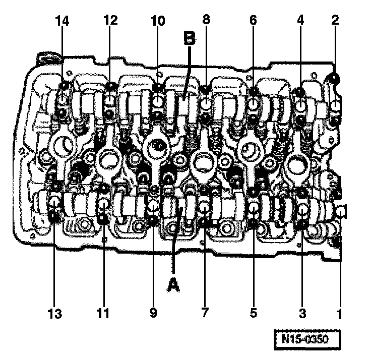- Install bearing caps 2 and 14 and tighten to 5 Nm plus 1/8 rotation (45 °).
