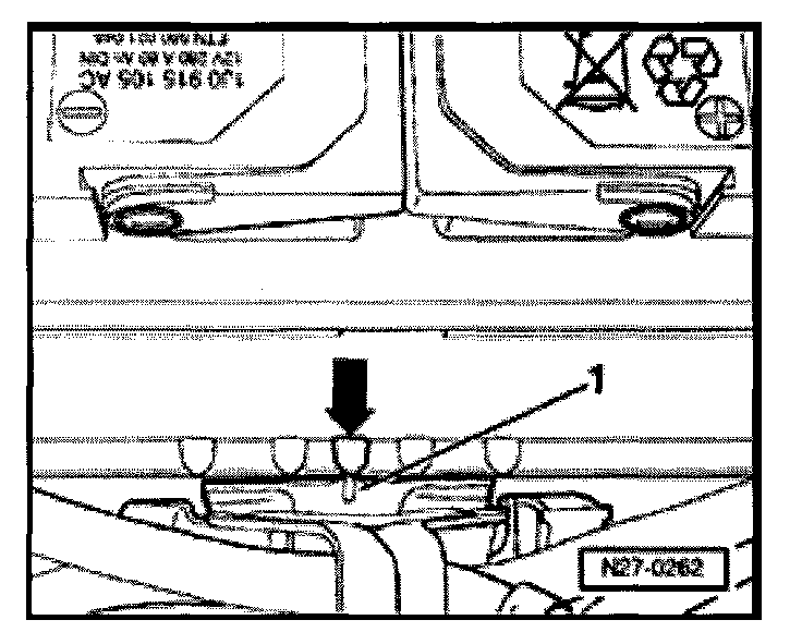 - Install battery so that the lug of the hold-down clamp -1- engages in the center cutout of the battery lower flange -arrow