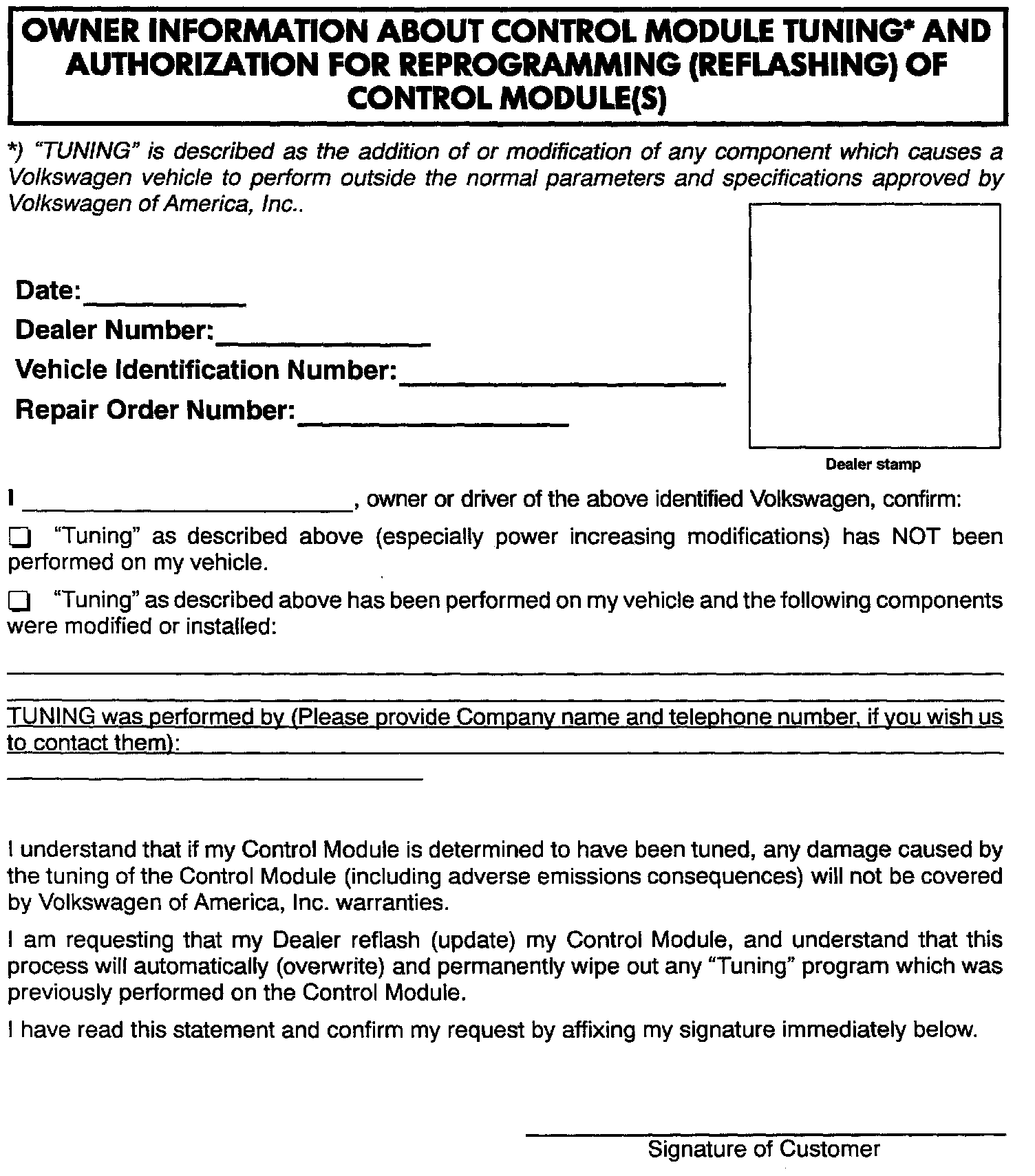 ^ Your Dealership should place the vehicle owner on notice in writing, that their ECM was found to have been tuned, and that any damage caused by the tuning of the ECM (including any adverse emissions consequences) will not be covered by Volkswagen of America, Inc. warranties.