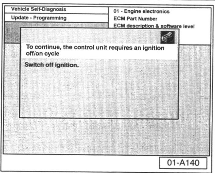 - Switch ignition ON when prompted. After switching ignition ON, the ECM has been re-initialized, however, fault memories must now be erased.