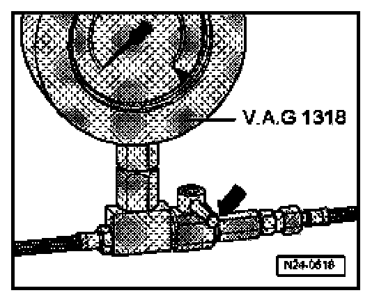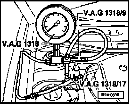 - Connect pressure gauge (V.A.G1318 using adapters V.A.G1318/9 and 1318/17) to supply line and hose for fuel distributor.