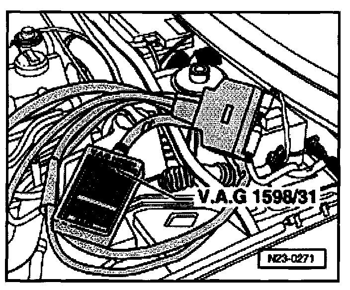 - Connect VAG 1598/31 adapter cable to control module wiring harness. Engine Control Module (ECM) is not connected.