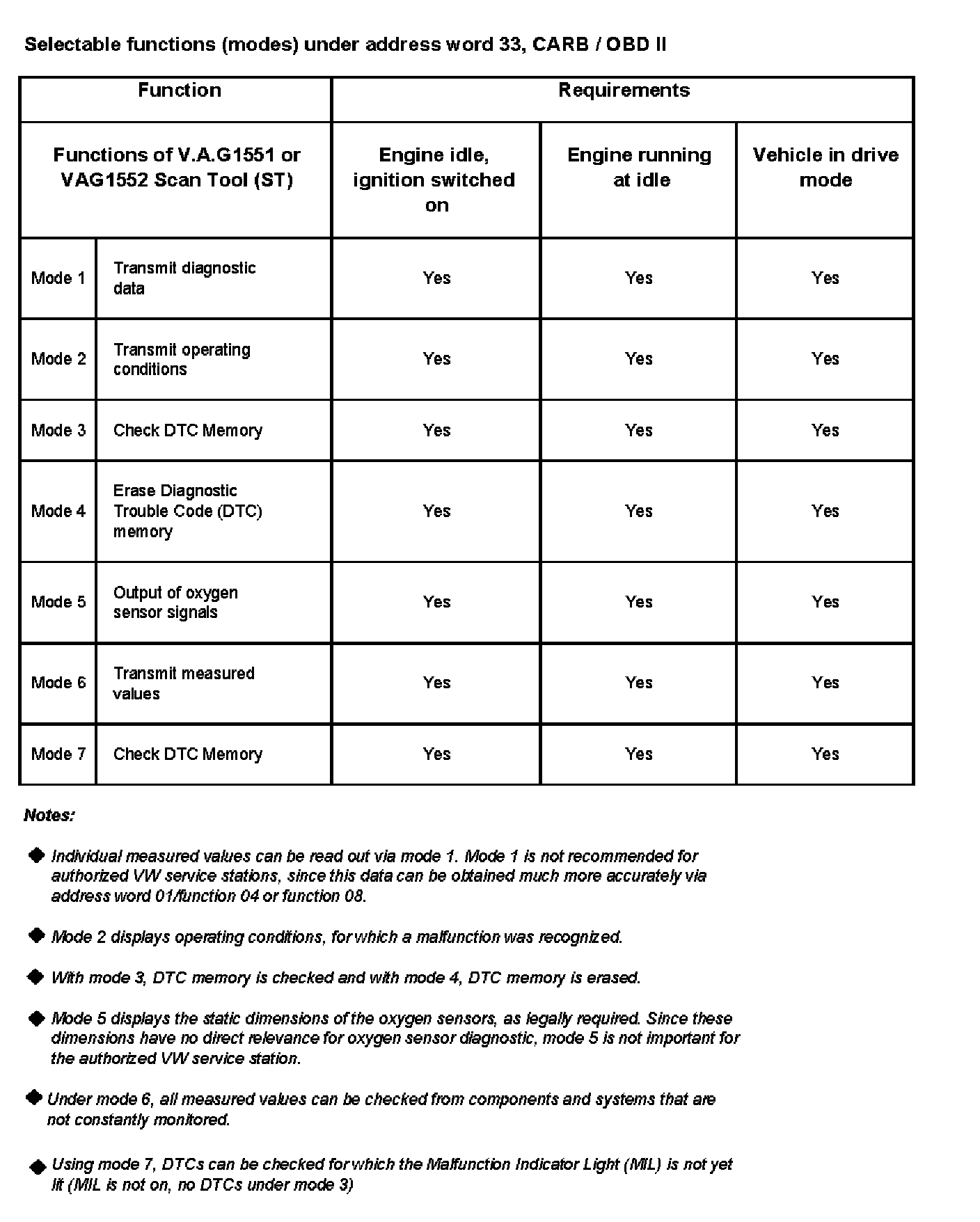 Selectable Functions (Modes) Under Address Word 33, CARB/OBD II