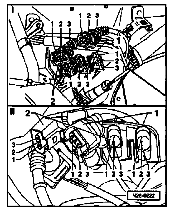 - Disconnect 3-pin harness connector to Knock Sensor (KS) 1 -G61- (green, item no.1) and/or 3-pin harness connector to Knock Sensor (KS) 2 -G66- (blue, item no. 2).