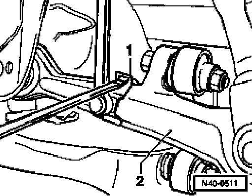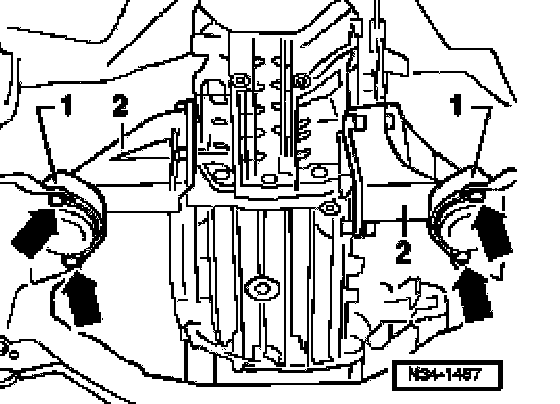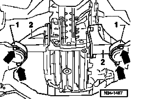 - Unscrew bolts -1- and -2- at rear of subframe on both sides of vehicle.
