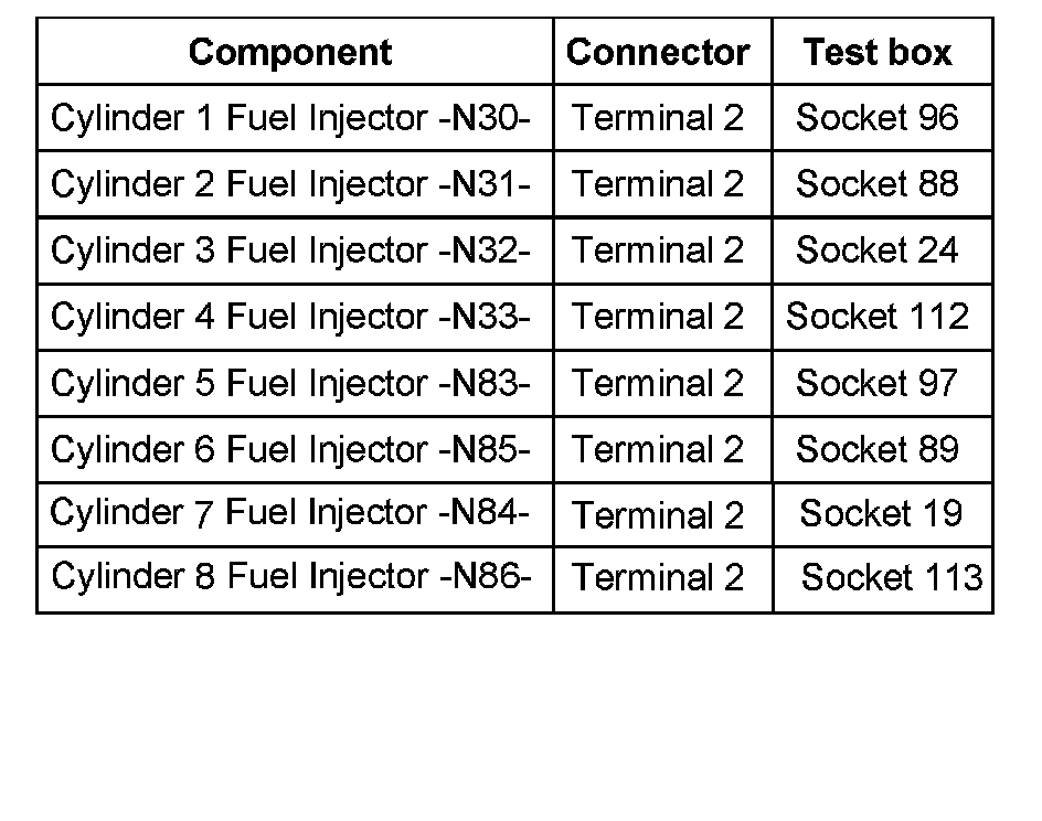 - Disconnect harness connector of fuel injectors (Cylinder 1 Fuel Injector -N30- to Cylinder 4 Fuel Injector -N33-, Cylinder 5 Fuel Injector -N83-to Cylinder 8 Fuel Injector -N86-), cylinder bank 1 and 2.