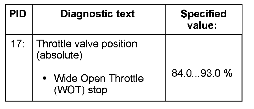 - Check specified value of throttle valve position (absolute) at Wide Open Throttle (WOT) stop:
